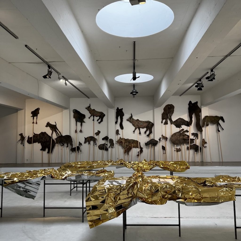 Dass sich in der gemeinsamen Zusammenarbeit auch nach einer vor einigen Jahren erfolgten Neufestlegung auf traditionelle Werkstoffe einiges an Freiheiten auftut, ist etwas, wovon sich hiesige Kunstguckerinnen und -gucker anlässlich der nun von Heinke Haberland kuratierten Ausstellung vergewissern können: Neben einiger Wheatpastes, sprich großer, auf die Wände tapezierter Papierarbeiten, erwarten einen dabei Ölbilder und bemalte Objekte angesichts derer sich eine überbordende figurative Motivik offenbart. Von grimassierenden Riesengesichtern über eine sich nahezu über die gesamte Längsseite des ehemaligen Schwimmbeckens erstreckende Tierkarawane bis hin zu einem in kurzen Hosen von einer Heimwerkerleiter herabstürzenden Herrn herrscht hier anarchische Betriebsamkeit. Alles eskaliert nach jeweils eigener Manier oder scheint einem etwaigen Kontrollverlust lustvoll entgegen zu taumeln. Einem besonderen Sinn für Materialgerechtigkeit Rechnung tragend korrespondiert die papierene Beschaffenheit der Bildträger mit den kunstvoll ins Dreidimensionale geknickten und gefalteten Gestalten, so dass beides ununterscheidbar wird und alles wie einmal durch die Mangel gedreht erscheint. Ohne in allzu dezidierte Richtungen zu weisen, tun sich im Zusammenspiel aus leicht ramponierter Optik, greller Farbigkeit und ungestümer Expressivität ein paar ikonographische Bezugsmöglichkeiten auf. Gerade im Kontext der unter architektonischen Gesichtspunkten hervorhebenswerten Räumlichkeiten, bei welchen es sich früher um ein privates Schwimmbad im Untergeschoss eines Paul-Schneider-Esleben-Baus gehandelt hat, mögen einige an ein zeitgemäßes Mash-up manieristischer Fresken wie beispielsweise Giulio Romanos Gigantensturz denken. Nicht weniger ließe sich eine amorphe Körperlichkeit, die im Zuge einer Gesamtschau des hier Gezeigten verschiedentlich ins Auge fällt, mit der Motivik eines Francis Bacon in Abgleich bringen. Viel mehr als in einer diesbezüglichen Konkretisierbarkeit scheint der eigentlich rote Faden aber im bricolageartigen Zusammenfügen disparater formensprachlicher Fragmente zu bestehen, welches nebst sprachspielerisch dahinassoziierter Werktitel ausreichend Luft für interpretatorische Alleingänge lässt.